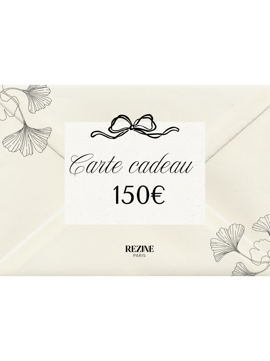 En panne d'idées pour Noël ou un anniversaire ? Offrez une carte cadeau du montant de votre choix et recevez une carte numérique contenant un code promo à dépenser pendant un an sur l'ensemble du site REZINE PARIS. Ainsi, vous êtes certain(e) de faire plaisir sans vous tromper ! Si vous souhaitez personnaliser la carte, vous pouvez nous glisser le nom à ajouter dessus via l'adresse mail : contact@rezineparis.fr ou à l'étape du paiement dans les commentaires.