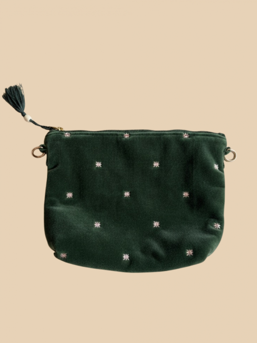 Son style bohème étoilé et sa matière en velours rappellent les vestes karma de la capsule Talisman. Deux anneaux dorées vous permettent d'y fixer une hanse afin de choisir de la porter épaule ou bandoulière la journée, pour plus de praticité.
