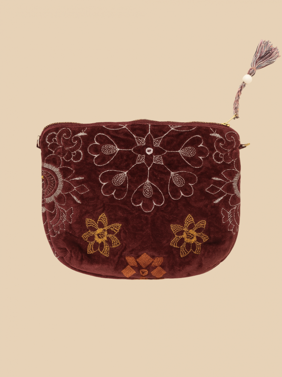 Son style bohème fleuri et sa matière en velours rappellent les vestes Totem et karma assorties. Elles ont été confectionnées avec les chutes des vestes afin de ne rien gâcher. Deux anneaux dorées vous permettent d'y fixer une hanse afin de choisir de la porter épaule ou bandoulière la journée, pour plus de praticité.