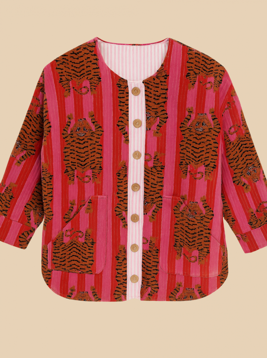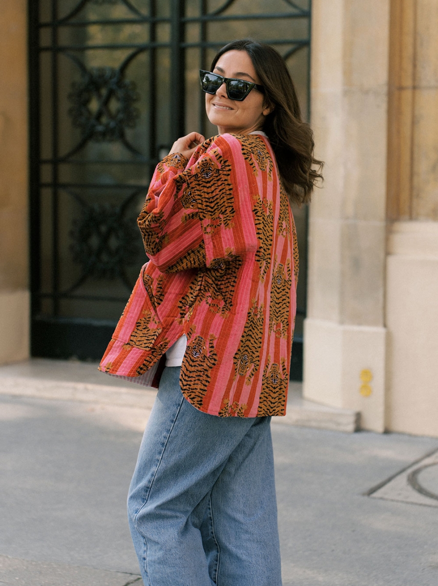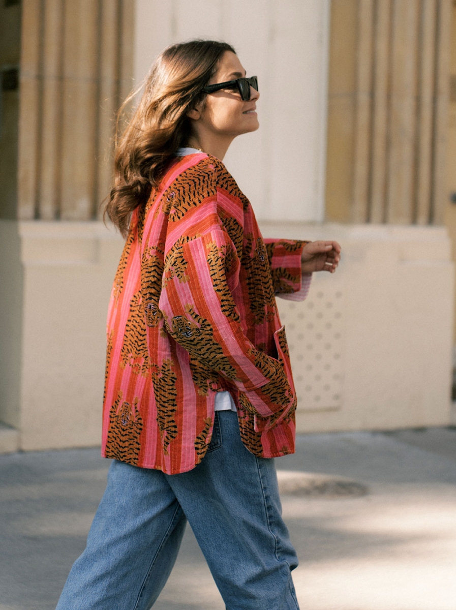Son imprimé tigre vintage sur fond rose flamboyant donne du caractère à vos looks, tout en se mariant à n'importe quelle pièce. Sa coupe ample et sa parementure contrastante apporteront un souffle bohème et originale à vos looks.