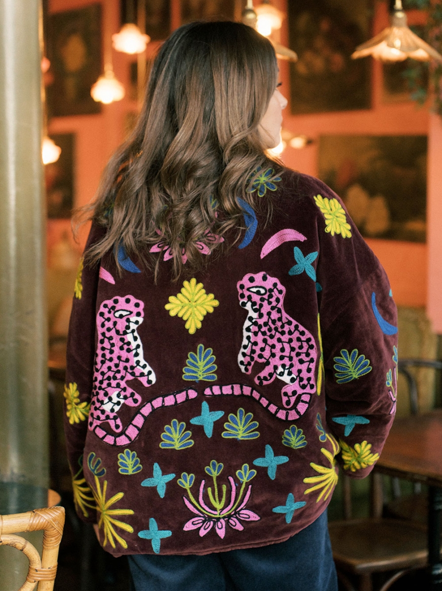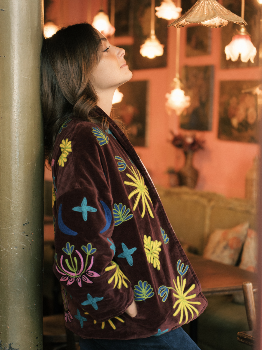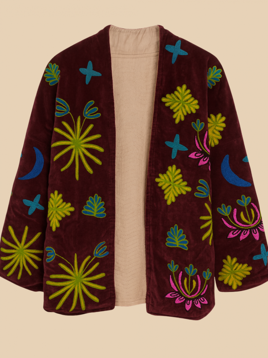 Karma, c’est la veste doudou de la mi-saison qu’on n’a plus envie de quitter. En velours bordeaux profond, elle se distingue par ses broderies indiennes vibrantes et tire son inspiration de l'univers onirique et mystique.