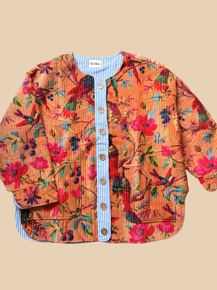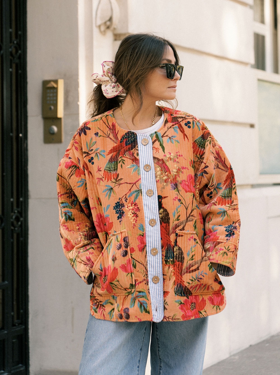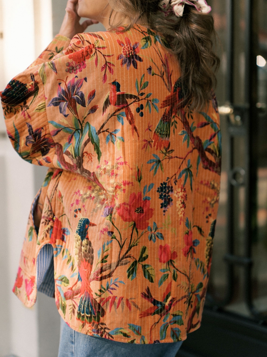 Son imprimé tapisserie vintage sur fond orange flamboyant apporte une touche automnale à vos tenues. Sa coupe ample et sa parementure contrastante la rende originale et bohème.