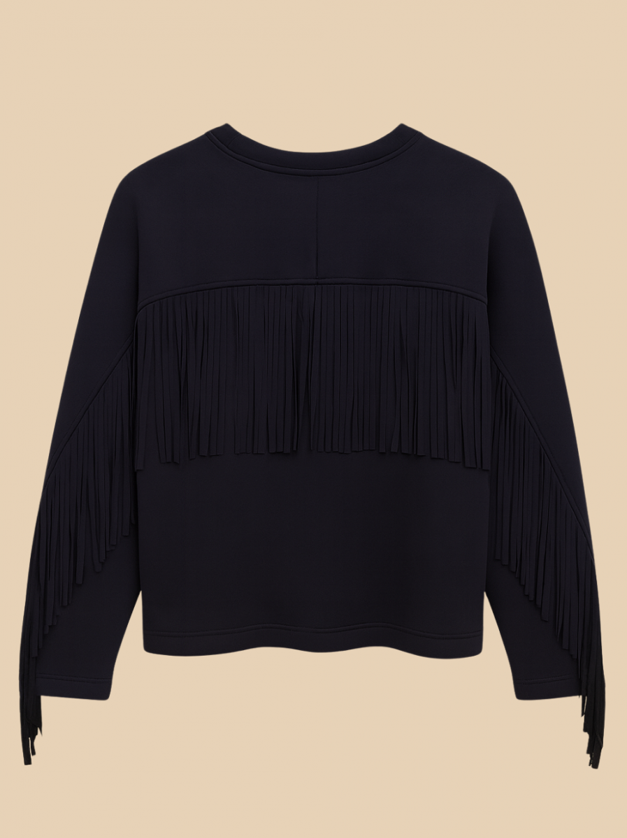 Une coupe ample épurée twistée par des franges ton sur ton dans le dos et sur les manches pour une allure western chic, pleine de mouvement. On adore sa matière en viscose ultra douce, fluide et légère : un bonheur à enfiler pour une journée chill ou un trajet en train.