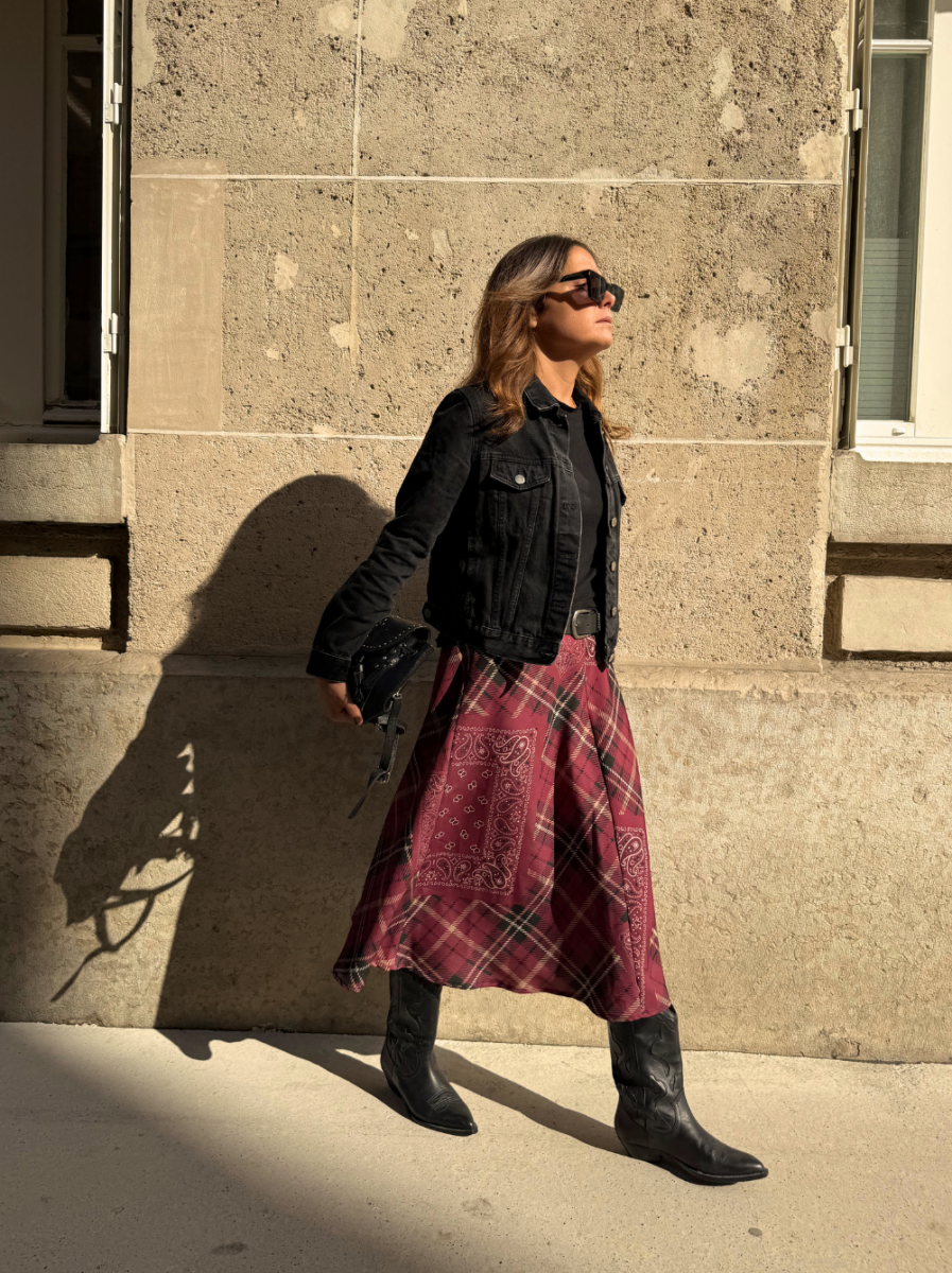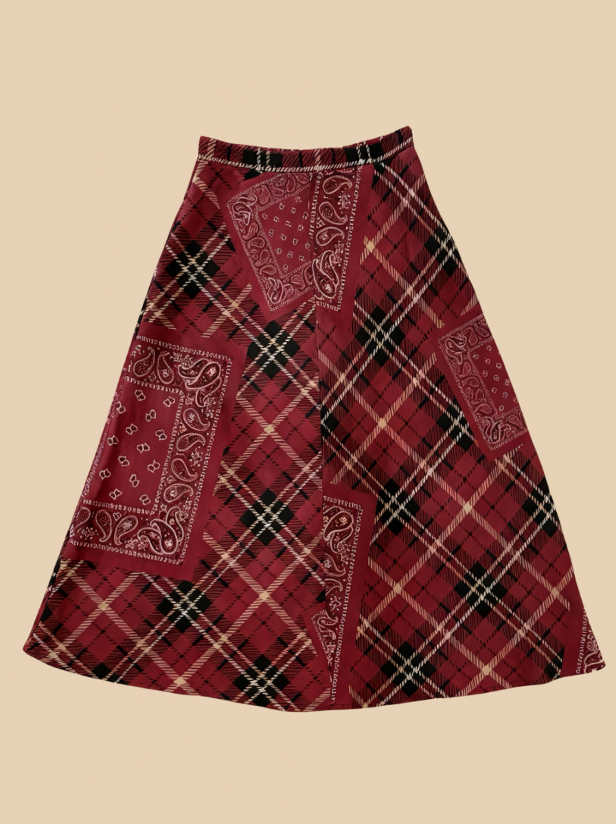 Son imprimé tartan bordeaux twisté de patchs bandana lui donne une allure de cowgirl urbaine, entre esprit vintage et modernité décontractée. Sa Coupe midi évasée flatte toutes les silhouettes