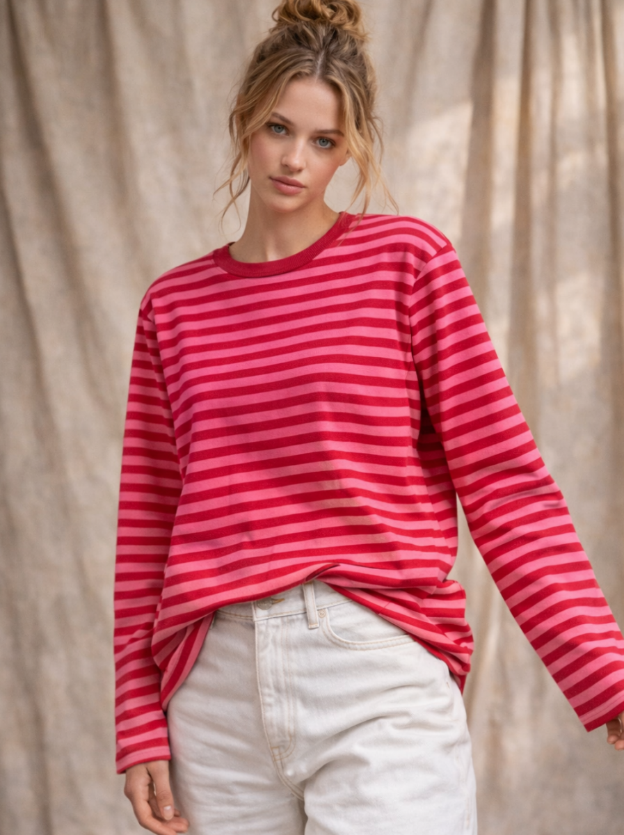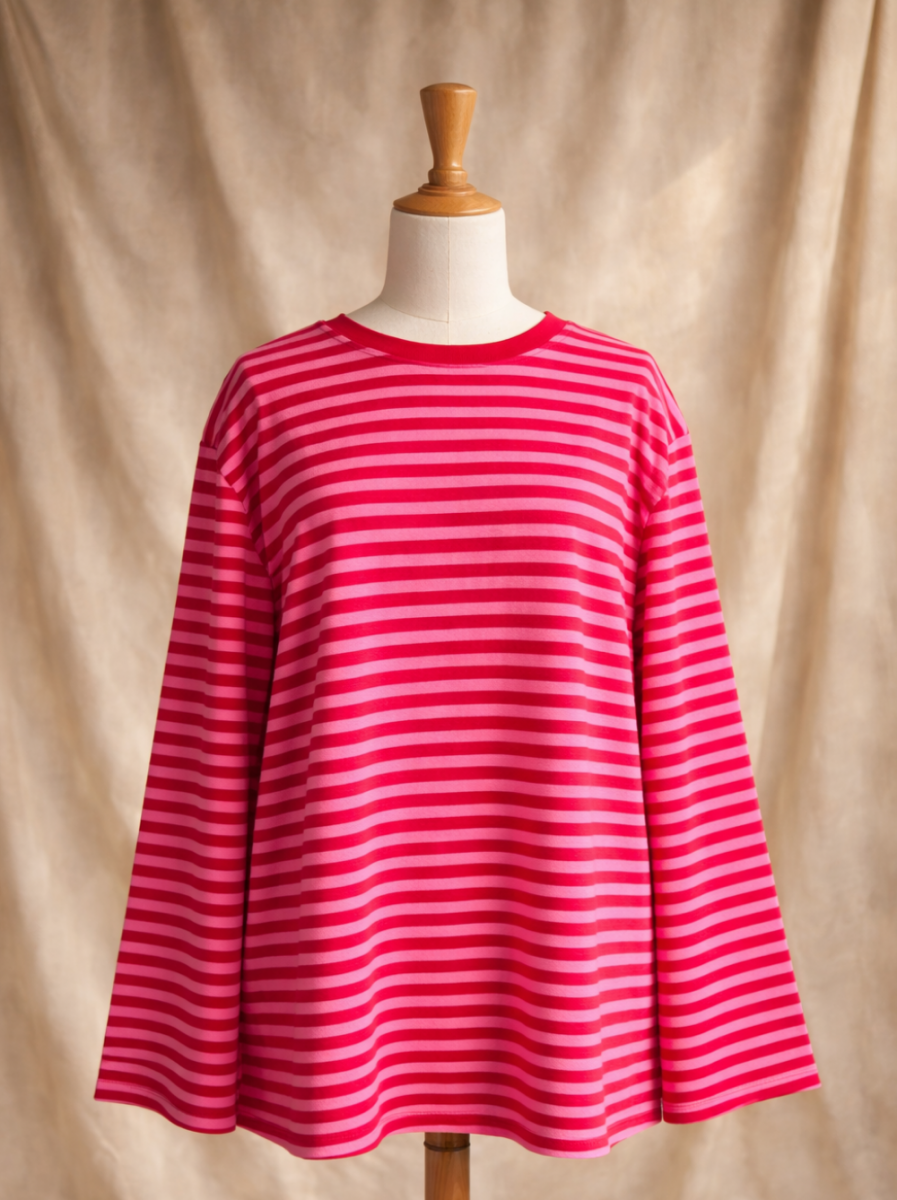 Rayures framboises gourmandes inspirées des sorbets d’été, coupe ample et manches longues pour la mi saison. Une pièce confortable, colorée et versatile, qui apportera une touche de fraicheur à vos looks. À porter toute l'année.